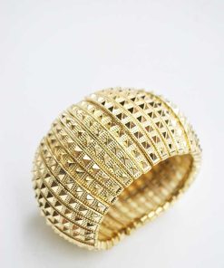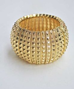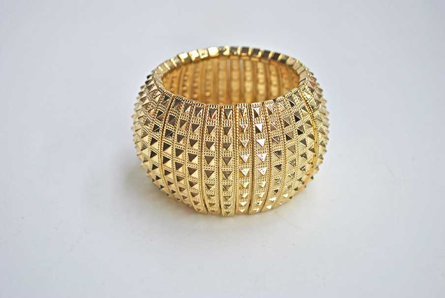 R03/5365 – Precioso brazalete dorado. Se trata de un brazalete elástico fabricado en metal ligero dorado y decorado con tachuelas también doradas.
