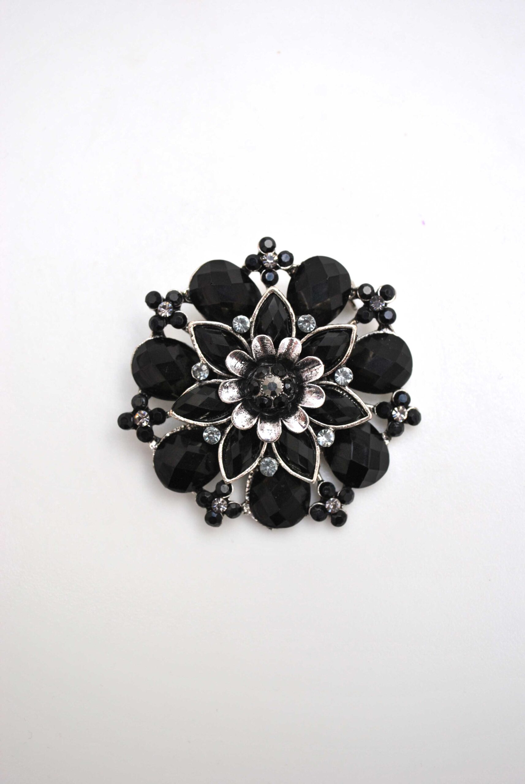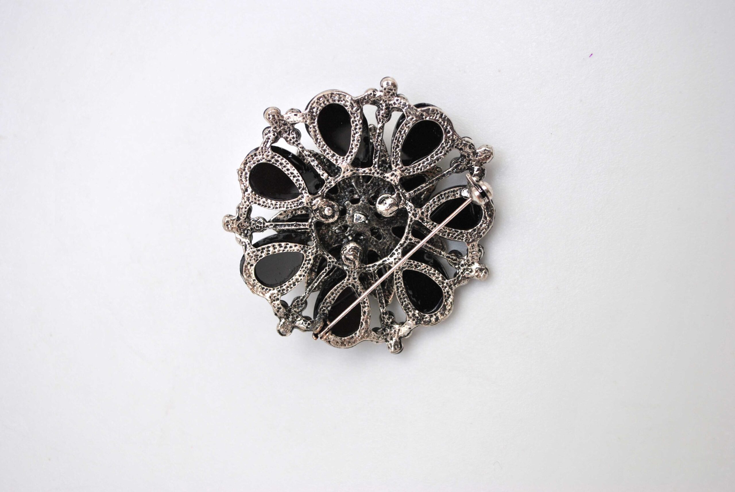 REF: 30385 – Elegante broche de estilo vintage presenta un diseño floral sofisticado, elaborado con cristales negros facetados y detalles en tonos plata envejecida. La estructura metálica simula delicados pétalos superpuestos que evocan una flor en plena floración, mientras que pequeñas piedras brillantes en tonos claros acentúan el centro y el contorno, aportando un sutil contraste. Su cierre tipo alfiler en la parte trasera permite sujetarlo con seguridad.