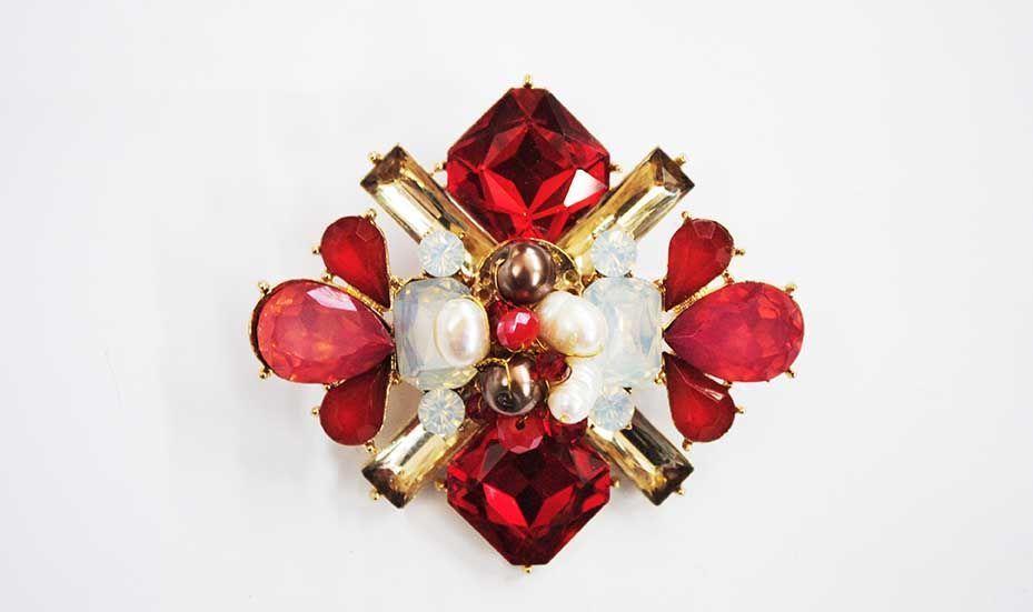 R19/2255 – Vistoso y original broche para vestidos de fiesta o para alegrar cualquier prenda, diseño en forma de flor pétalos en diferentes colores, destacando los cristales rojos y dorados.
