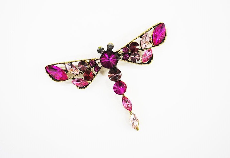 R21/3741 -Precioso broche de mujer fabricado en bisuteria dorada y diseñado con forma de una estilosa libélula de cristal combinados en tonos bugamvilla, rosas fucsias y rosas nude. Muy bonito para adornar cualquier prenda o para regalo.