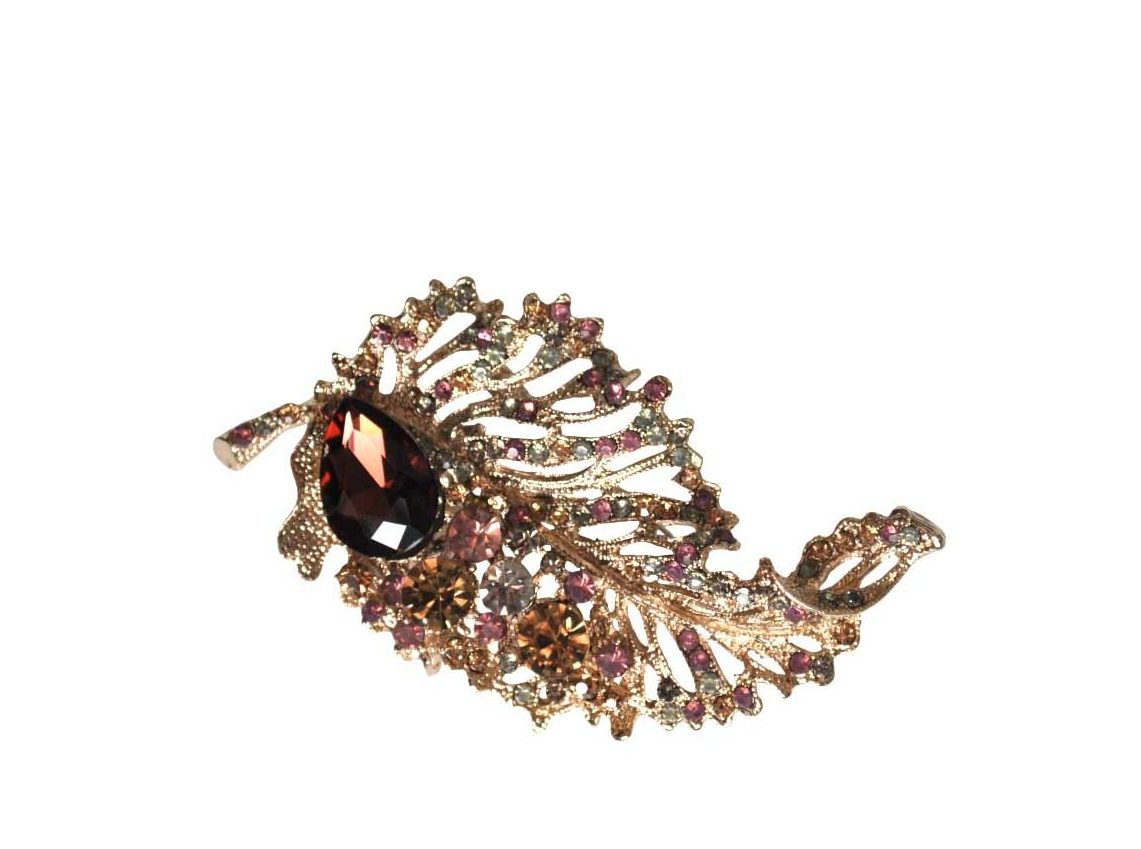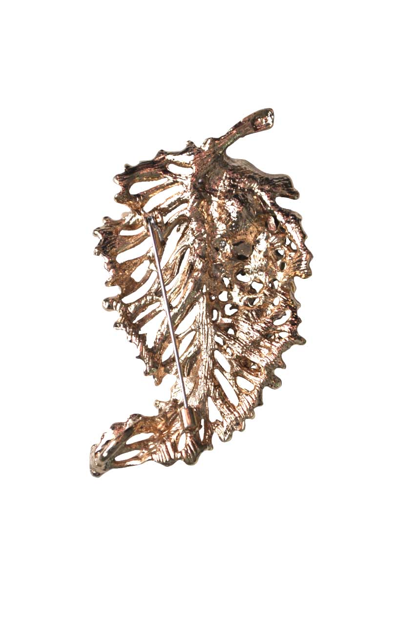 R04/5568 – Bonito y original broche de fiesta. Se trata de un broche diseñado en forma de hoja, fabricado en metal ligero dorado y decorado con pequeños cristales.
