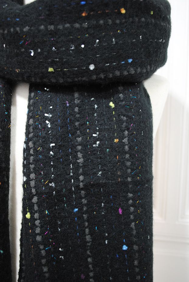 R19/3248 -Preciosa y calentita bufanda negra de mujer. Se trata de una bufanda con terminaciones en flequitos y decorada con elegantes hilos de colores.