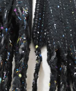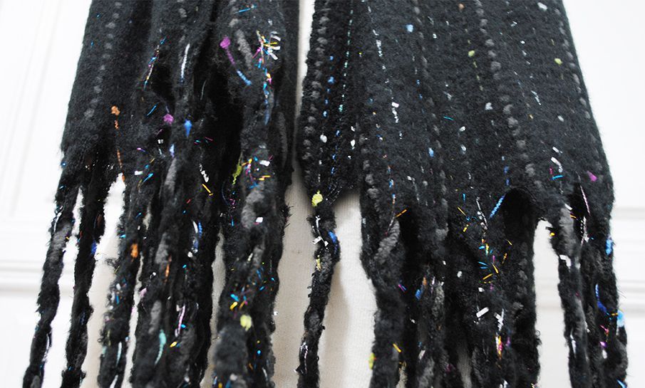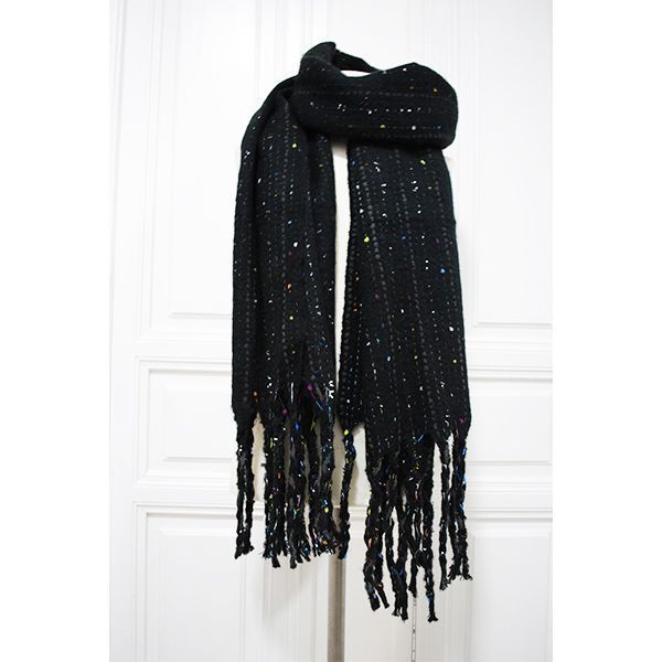 Preciosa y calentita bufanda negra de mujer. Se trata de una bufanda con terminaciones en flequitos y decorada con elegantes hilos de colores.