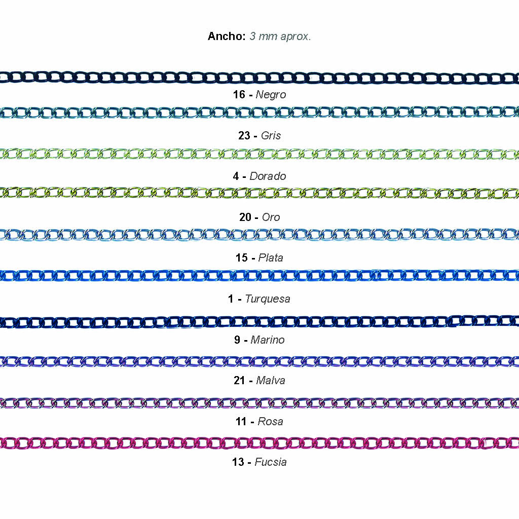 | Color | 1 / TURQUESA, 11 / ROSA, 13 / FUCSIA, 15 / PLATA, 16 / NEGRO, 20 / ORO, 21 / MALVA, 23 / GRIS, 4 / DORADA, 9 / MARINO |