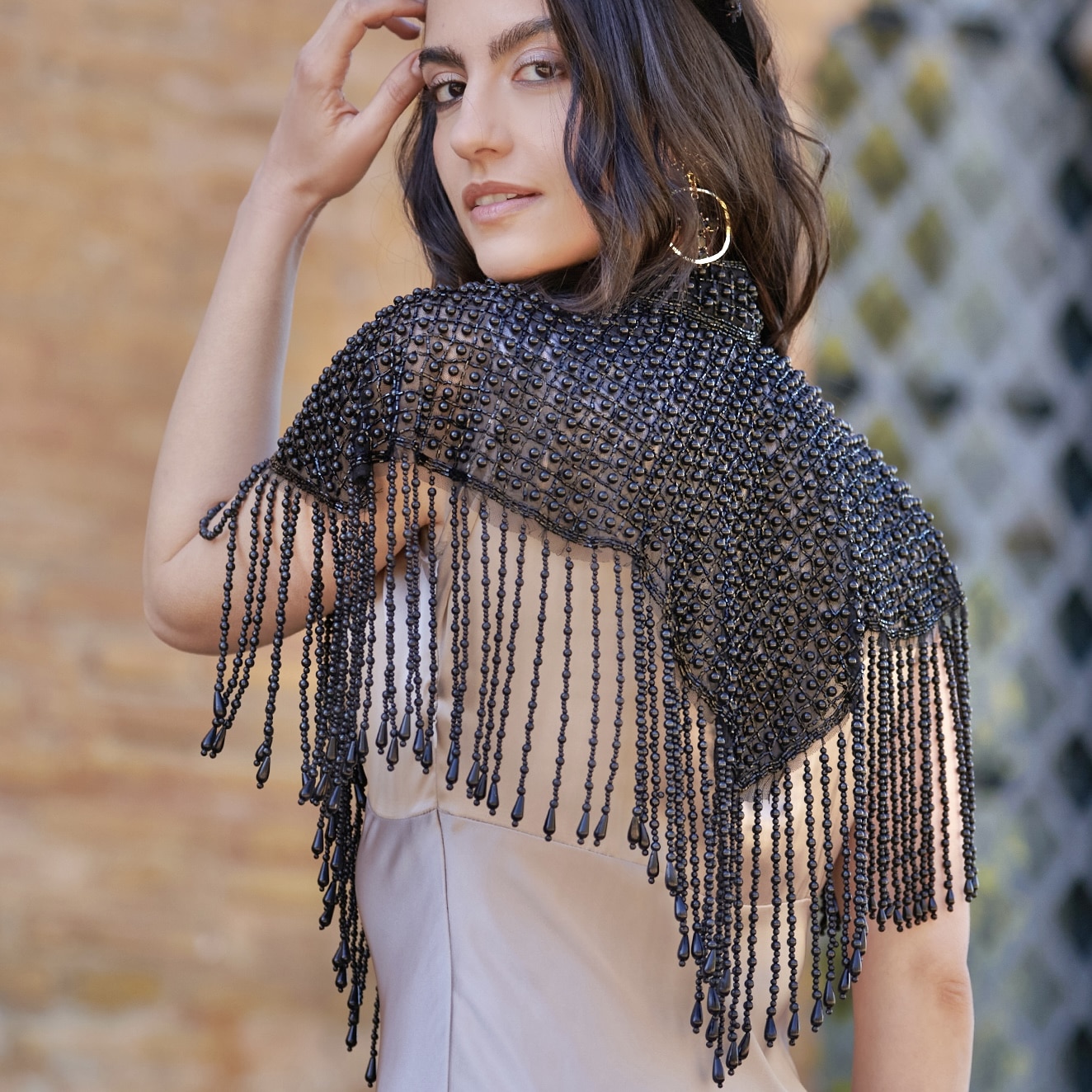 Su diseño combina perlas negras y pequeñas bolas sobre una base textil, terminada con flecos que aportan movimiento y profundidad. Es el tipo de accesorio que convierte un vestido básico en un look completo, con presencia y carácter.