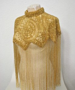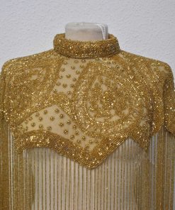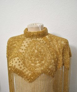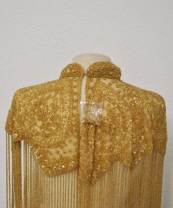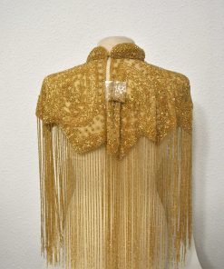 BI52526014 – Preciosa capa joya de fiesta. Se trata de una capa de piedras realizada manualmente con flecos de rocalla dorados y un espectacular bordado de rocallas a juego. El complemento perfecto en tus looks de fiesta. Ideal para todo tipo de eventos, cenas especiales o ceremonias como bodas de noche. Cierre de corchete muy sencillo de poner y utilizar.