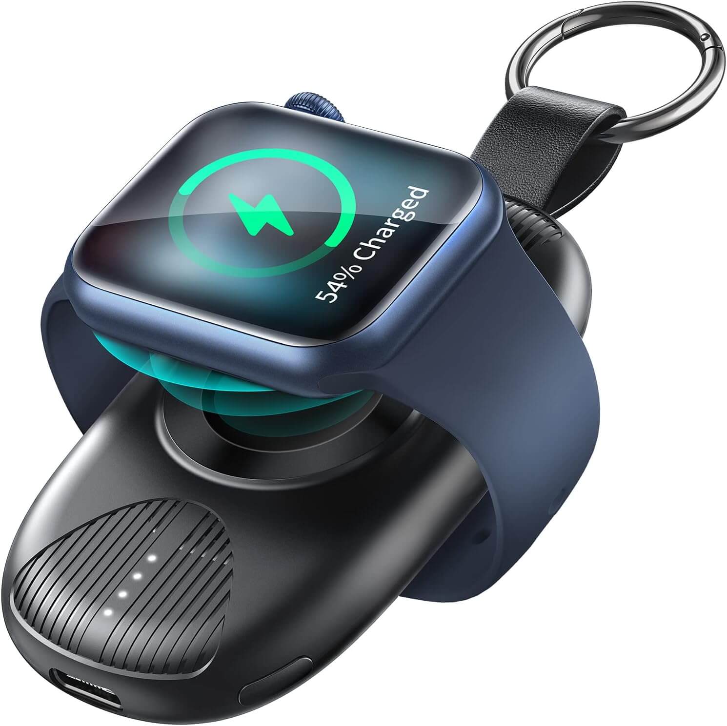 - Cargador portátil para una carga cómoda. Nuestro llavero cargador para Apple Watch cuenta con un tamaño pequeño, diseño portátil y compacto, por lo que es posible y cómodo de llevar para uso diario o de viaje. Desliza el cargador inalámbrico del tamaño de la llave del coche a tu bolsillo/cartera, o engánchalo en tu llavero o cremallera de mochila para evitar que se caiga accidentalmente.