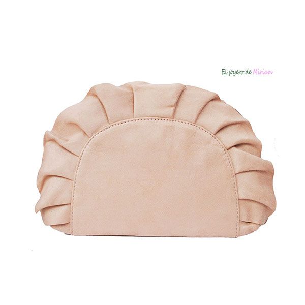 Original bolso o cartera de fiesta. Se trata de una cartera diseñada en forma de concha con pequeños pliegues y fabricada en antelina de color ROSA NUDE. Dispone de correa dorada para llevarlo más cómodamente colgado.