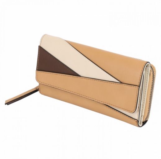 R18/2060 – Cartera, monedero o billetero de mujer. Está fabricado en polipiel de diferentes colores; camel, beige y marrón chocolate. El interior, con gran capacidad, consta de dos huecos para monedas, separados mediante una cremallera y varios compartimentos para tarjetas y fotografías.