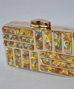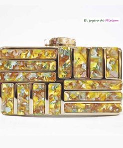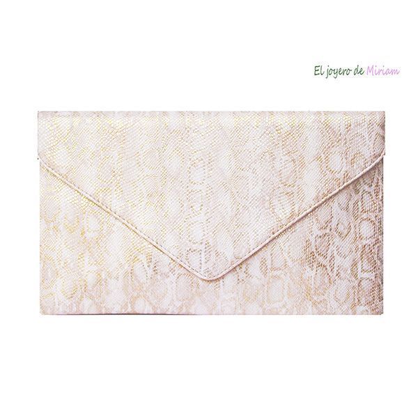 Preciosa cartera de fiesta o bolso de mano fabricado en polipiel. Se trata de una cartera de tipo sobre en color oro rosa metalizado con ligera textura y estampado de animal print. Cuenta con cadena larga en el interior para llevarla más comodamente colgada.