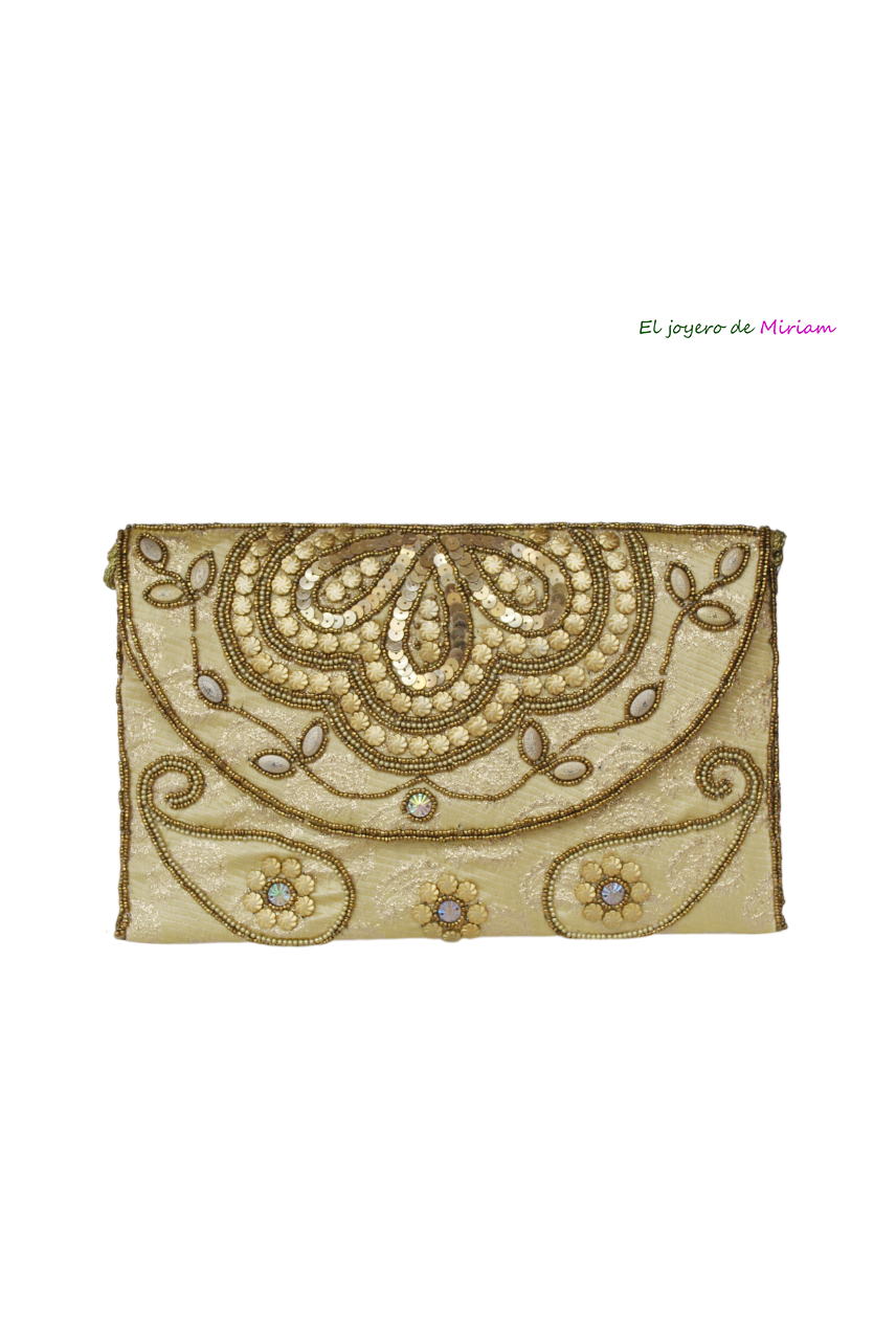 R092405BI5830 – Bonita cartera o bolso de fiesta dorado. Se trata de una cartera rectangular diseñada en tipo sobre y, forrada con tela dorada y con lentejuelas y bordados en dorado. Consta de un cordón dorado que hace de cadena para llevarlo más cómodamente colgado.