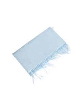 R04/5663- Original y elegante cartera de fiesta o bolso clutch azul celeste. Se trata de una cartera en color celeste, fabricada en antelina y diseñada rectangular, con solapa tipo sobre. Presenta decoración en el frente con un faldón de plumas vaporosas. Además, dispone de cadena dorada para colgar y llevarlo más cómodamente en el hombro.