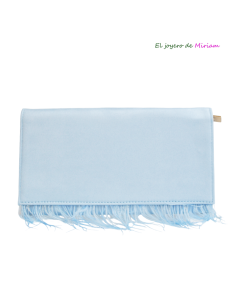 R04/5663- Original y elegante cartera de fiesta o bolso clutch azul celeste. Se trata de una cartera en color celeste, fabricada en antelina y diseñada rectangular, con solapa tipo sobre. Presenta decoración en el frente con un faldón de plumas vaporosas. Además, dispone de cadena dorada para colgar y llevarlo más cómodamente en el hombro.
