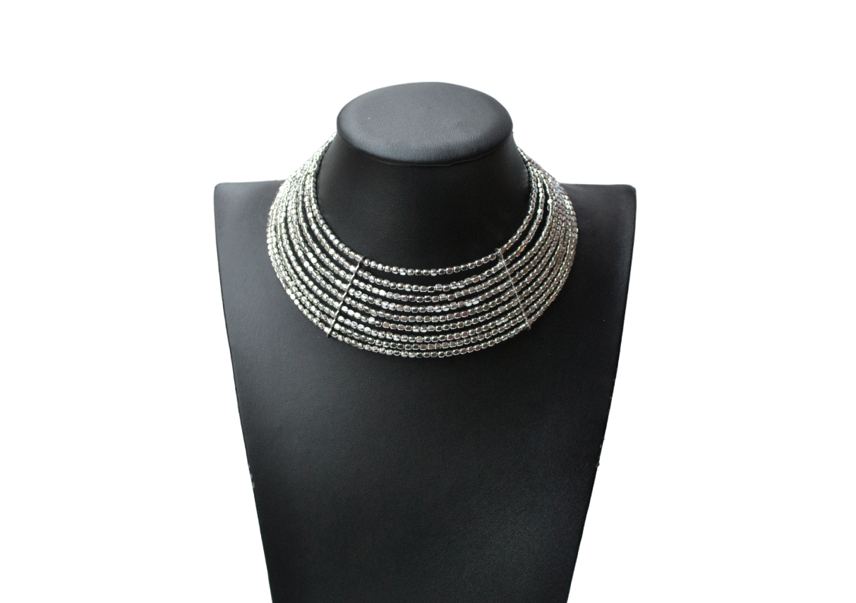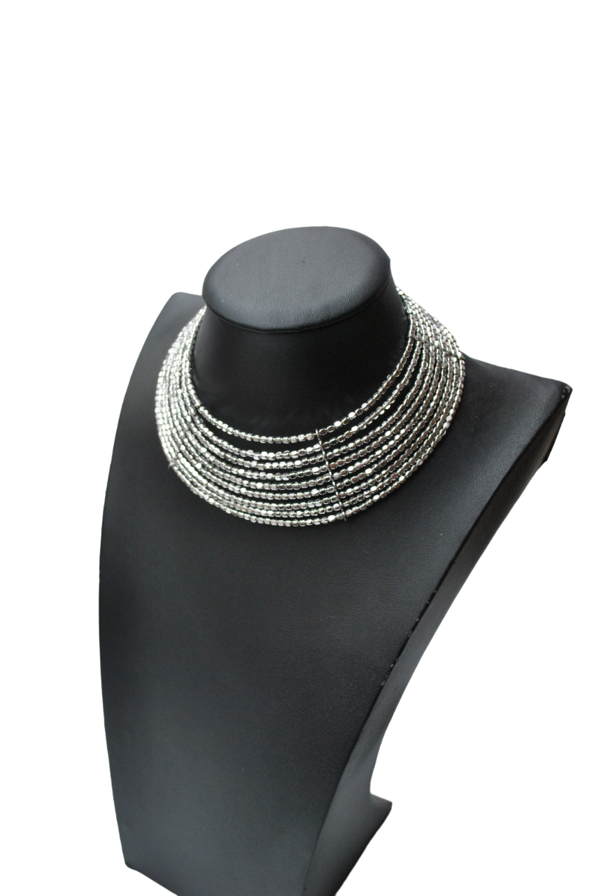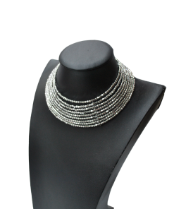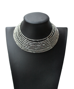 TPB0905245852 – Colgante o collar choker ajustado al cuello fabricado en bisutería plateada con varias vueltas y con elegantes cuentas plateadas.
