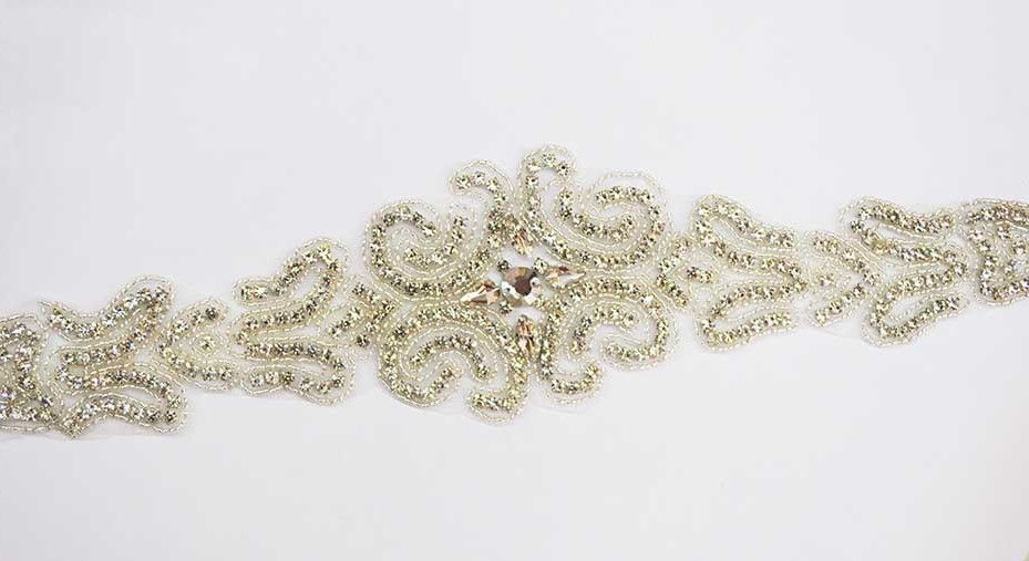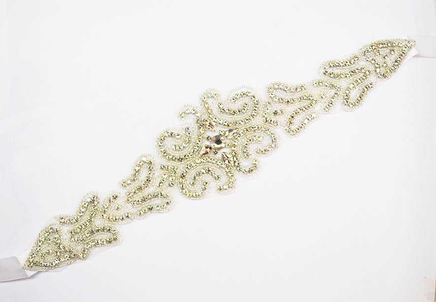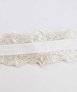 R18/1813 -Elegante fajín de novia o cinturón con pedrería ideal para vestidos. Se trata de un cinturón decorado con aplicación central de pedrería blanca y lazo de raso blanco, perfecto para hacer una lazada en la parte trasera.