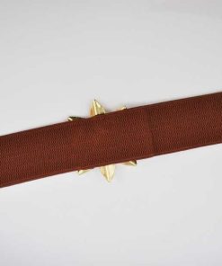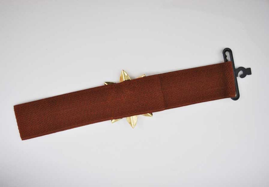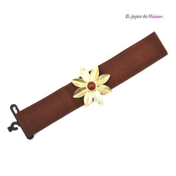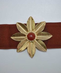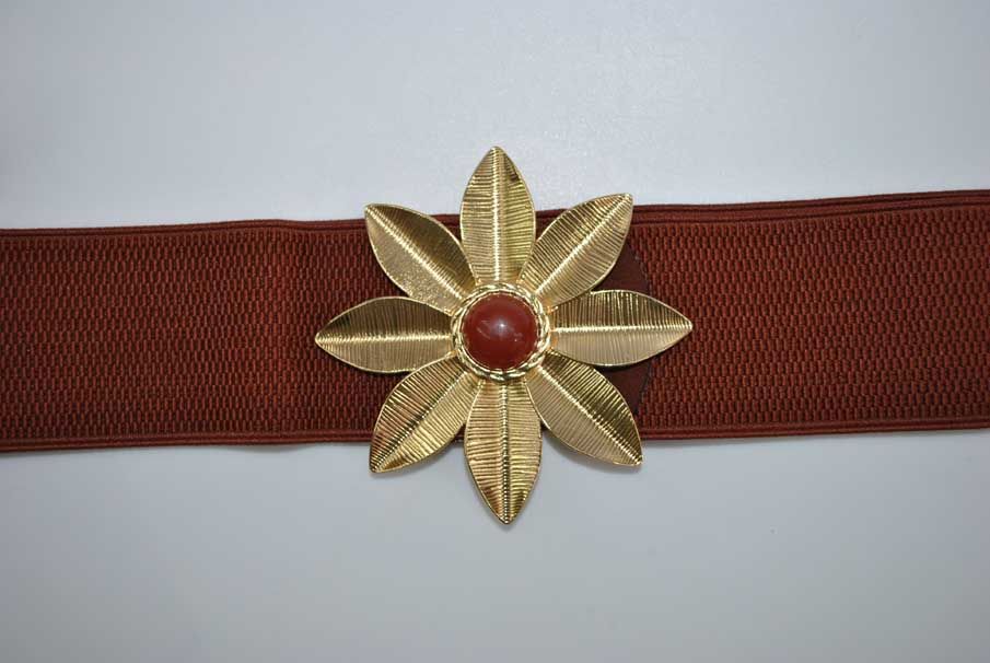 R02/4829 – Precioso fajín o cinturón elástico de fiesta en color naranja teja. Se trata de un cinturón con goma elástica y con la decoración central de una flor dorada de metal con una piedra circular de resina en color verde teja.