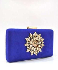 R02/4633 -Elegante bolso clutch o cartera de fiesta de color AZUL KLEIN, fabricado en antelina y diseñado con forma rectangular. Cómodo y original. El frente, está decorado con pedrería, a base de pequeños cristales dorados. Incluye cadena dorada para colgar.