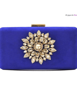 R02/4633 -Elegante bolso clutch o cartera de fiesta de color AZUL KLEIN, fabricado en antelina y diseñado con forma rectangular. Cómodo y original. El frente, está decorado con pedrería, a base de pequeños cristales dorados. Incluye cadena dorada para colgar.
