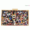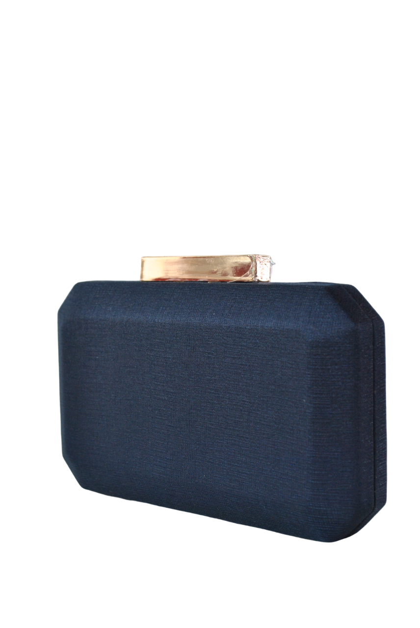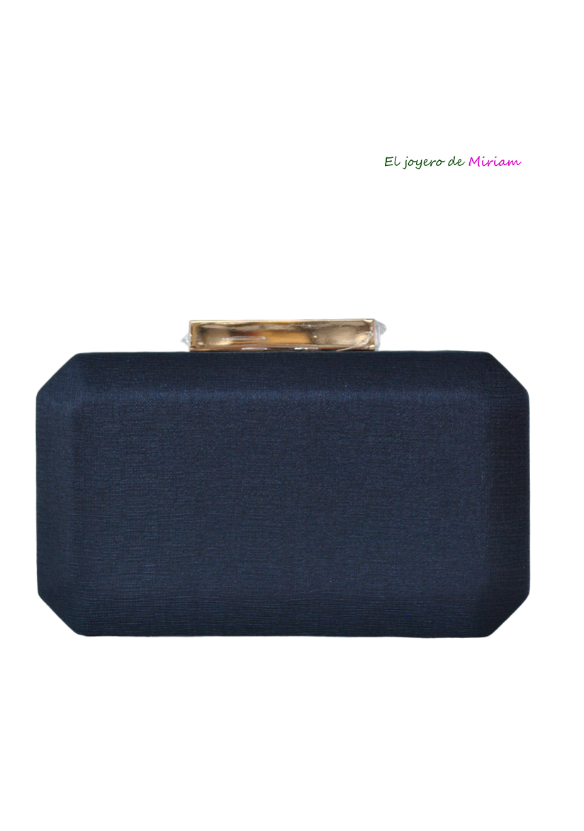 240911AD5832  – Elegante bolso clutch o cartera de fiesta de color azul marino fabricado en tela con ligero brillo y ligera textura de rayas, diseñado en ligera forma octagonal. Lleva la montura y la cadena larga en dorado, detalle de cierre alargado y rectangular, cómodo y original.