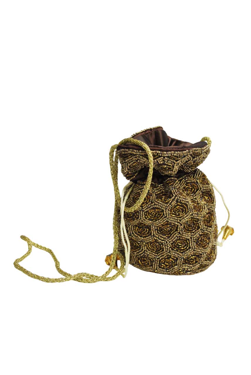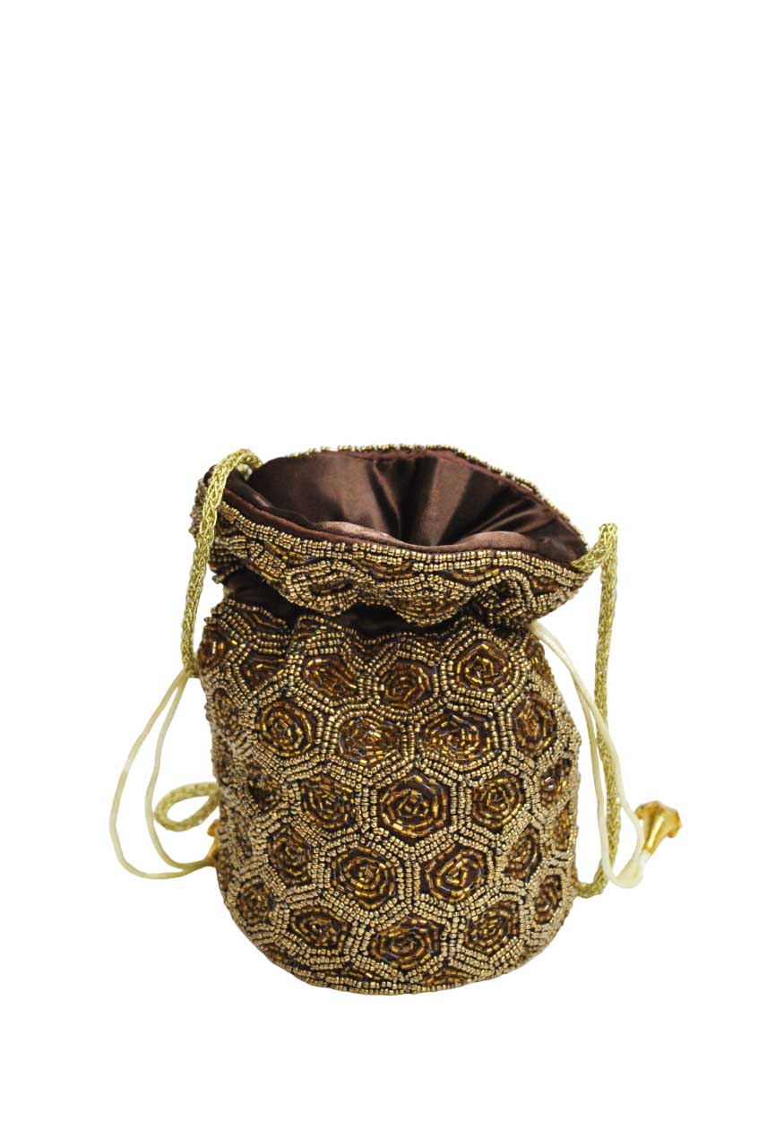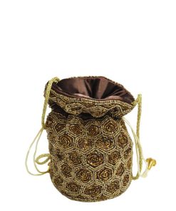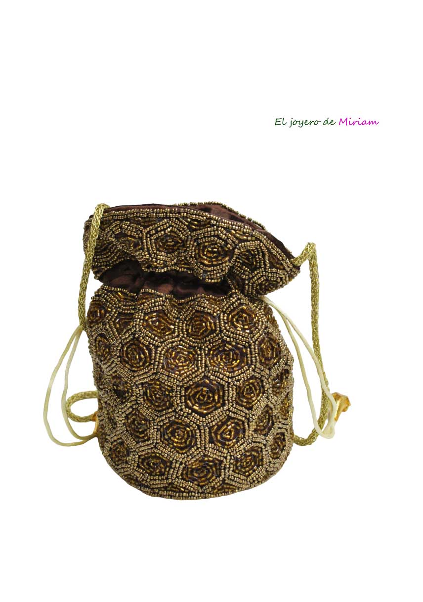R04/5583 – Glamuroso bolso de fiesta, clutch o bolso bombonera de color marrón chocolate decorado con lentejuelas doradas. Un bolso original y con un estilo diferente para completar tu vestido de fiesta o tus looks diarios