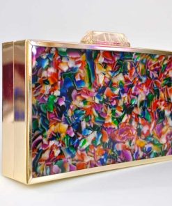 Estiloso bolso de fiesta clutch MULTICOLOR o cartera de fiesta con acabado acrílico, un bolso rígido diseñado en forma de cajita. Dicho bolso se puede utilizar tanto de noche como de día, posee una abertura y cierre con broche metálico a presión, además disfrutarás cómodamente de su cadena dorada para colgarlo al hombro muy original.