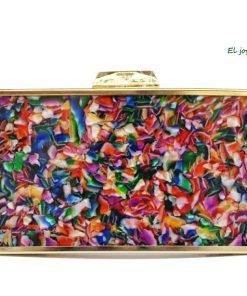 Estiloso bolso de fiesta clutch MULTICOLOR o cartera de fiesta con acabado acrílico, un bolso rígido diseñado en forma de cajita. Dicho bolso se puede utilizar tanto de noche como de día, posee una abertura y cierre con broche metálico a presión, además disfrutarás cómodamente de su cadena dorada para colgarlo al hombro muy original.