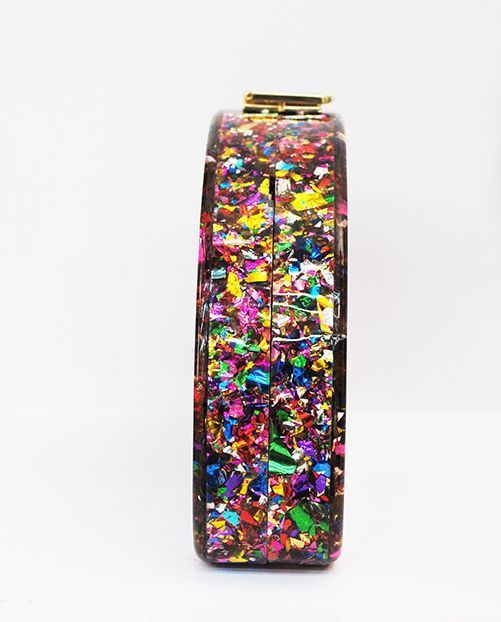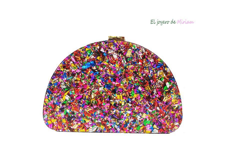 R03/5040 -Precioso bolso de fiesta, diseñado en forma ovalada de cajita rígida y decorado con incrustaciones de carey sintético «confetti». Sin duda, un bolso elegante y con diseño debido a sus líneas rectas, un bolso ideal para bodas o para la noche. Dispone de cadena dorada para colgar.