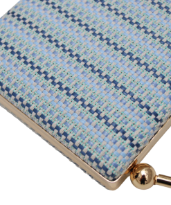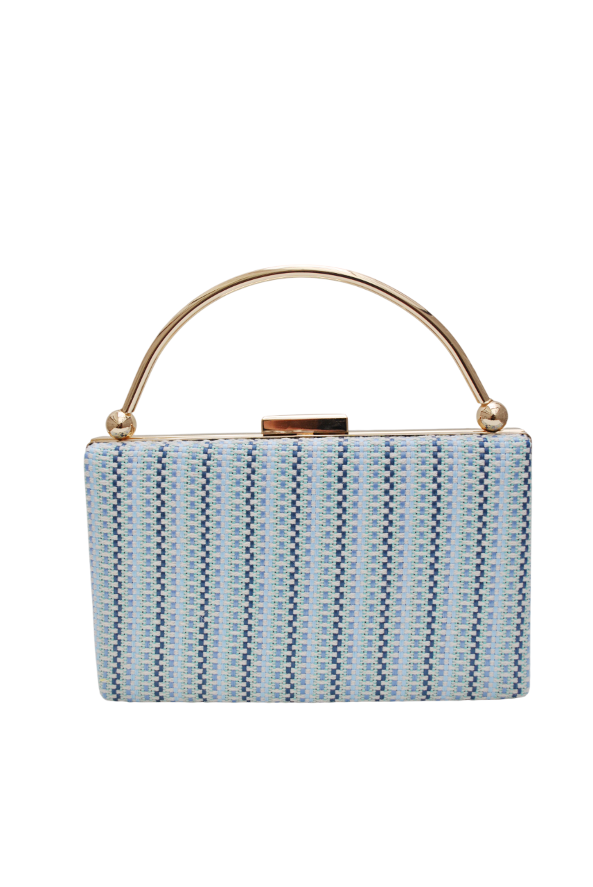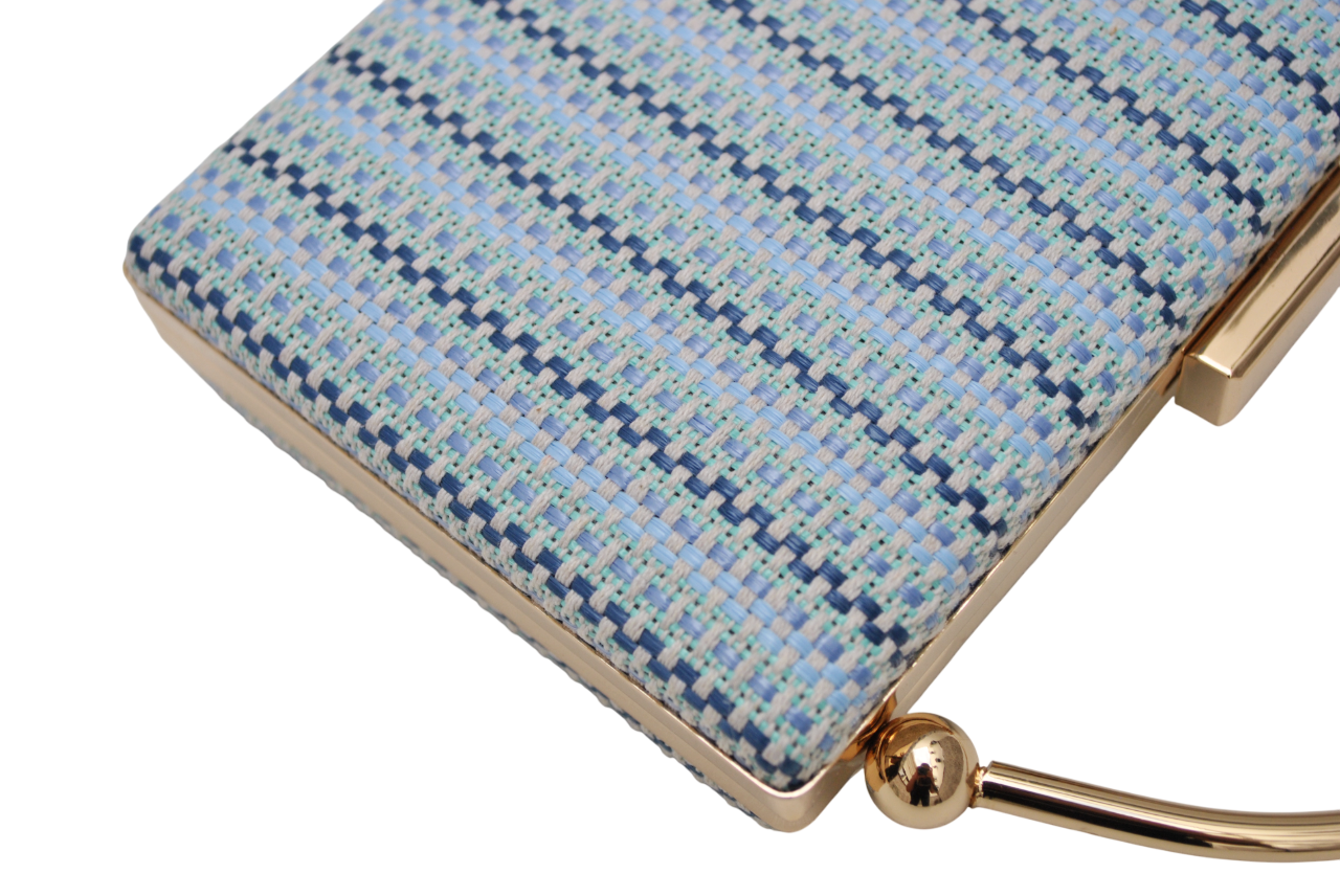 REF: BM- 0128830: Bolso de fiesta clutch multi tonos azules. Se trata de un bolso de fiesta o bolso de mano estructurado con diseño textil en tonos azul claro, celeste y detalles en azul marino, formando un delicado patrón entrelazado que aporta originalidad. Su elegante marco metálico dorado y asa curva con terminaciones esféricas lo convierten en una pieza refinada, ideal para eventos formales o un look de día chic. En el interior se incluye una cadena larga en dorado.