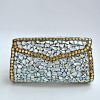 Precioso y original bolso clutch, cartera de fiesta decorado con glitter morado y azul. Se trata de un bolso muy original por su diseño; cuenta con la forma rectangular y, está decorado a base de bandas de metal dorado formando atractivas figuras geométricas. Por último, cuenta con cadena dorada para colgar.