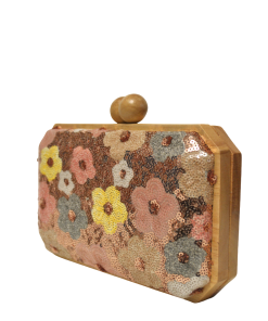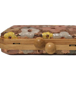 R1526018 – Bonito y original bolso de fiesta clutch. Se trata de un bolso con la montura y el broche de madera. Tanto por la parte delantera como por la parte trasera tiene bordados de flores con lentejuelas en diferentes colores. En el interior se incluye una cadena en dorado para llevarlo colgado.