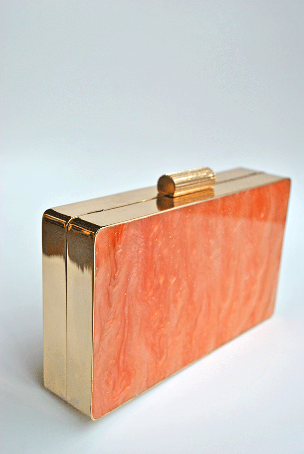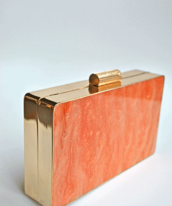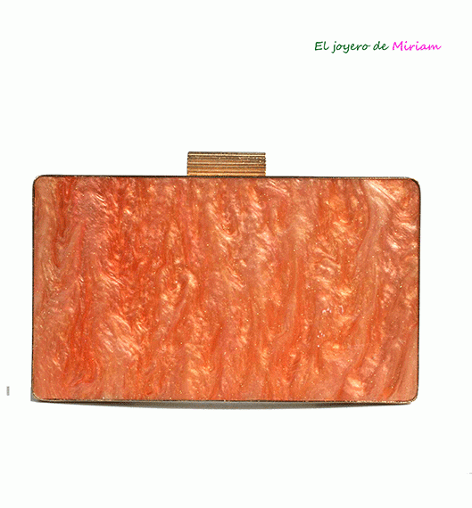 R03/5428 – Espectacular bolso de fiesta o clutch naranja. Se trata de un bolso diseñado en forma de cajita y decorado con incrustaciones de nácar sintética en un atractivo color naranja. Lleva la montura y el broche en dorado, igualmente la cadena dorada que presenta en el interior, perfecta para llevarlo más cómodamente colgado en el hombro.