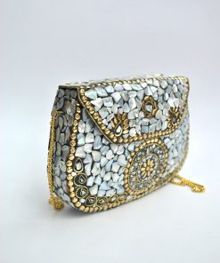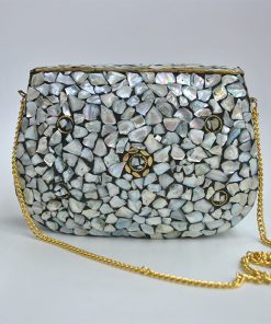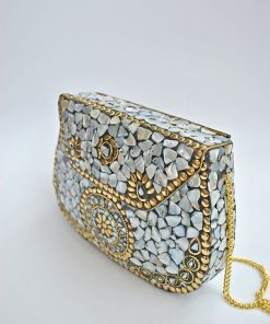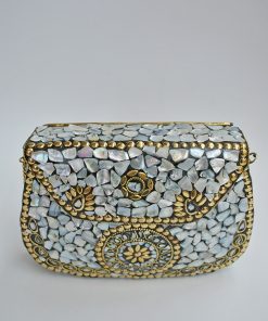R03/5316 – Precioso bolso de fiesta clutch rígido. Se trata de un original bolso de fiesta fabricado artesanalmente en latón dorado. Destacan incrustaciones de nácar blanca aportando elegancia y vistosidad al diseño. Además, incluye cadena plateada para llevarlo más cómodamente colgado.