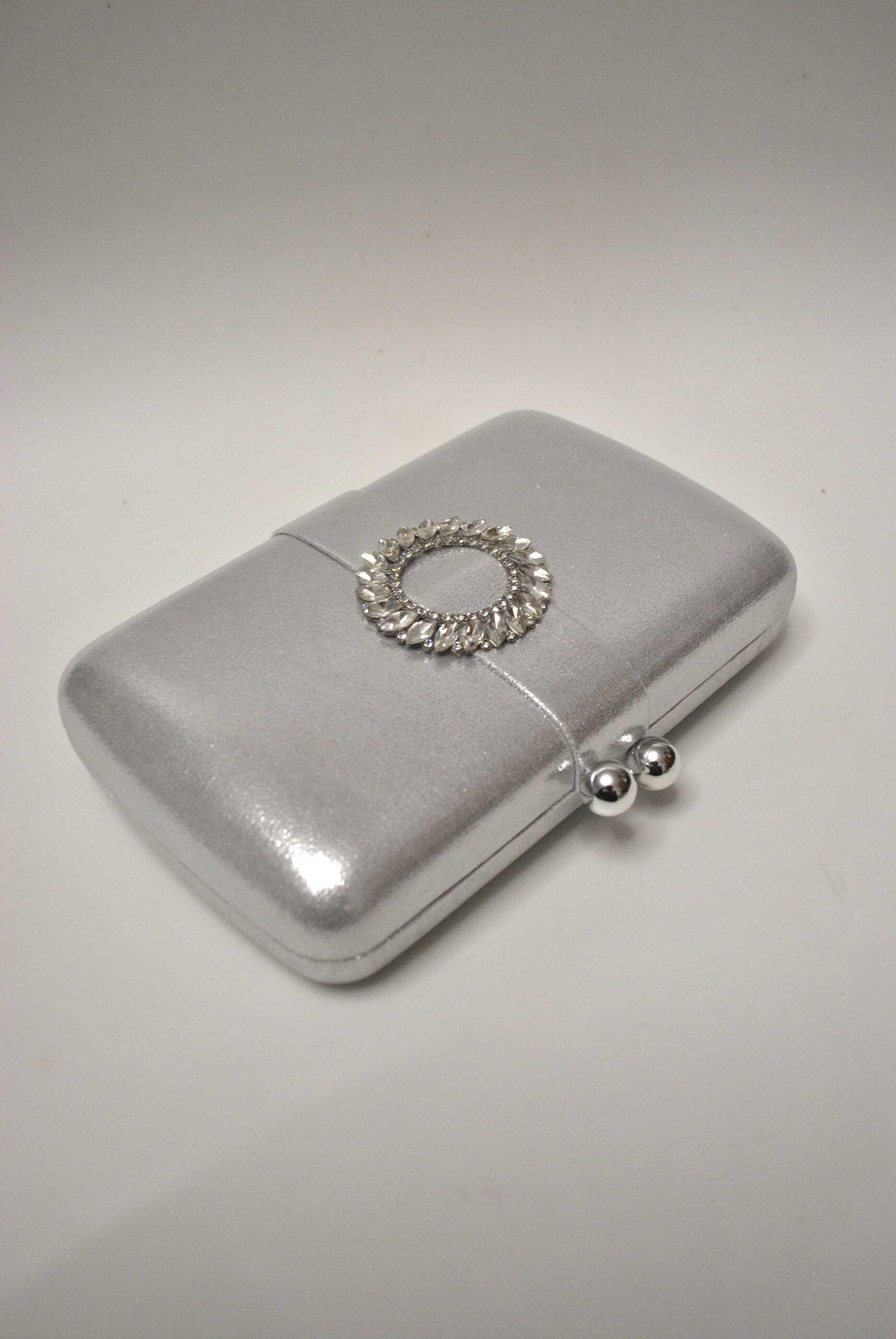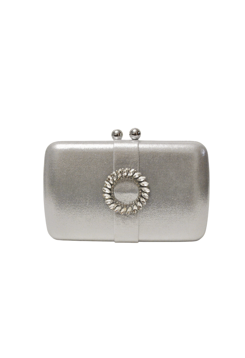 R105665 – Bonito bolso de fiesta clutch plateado joya. Se trata de un bolso ovalado con broche metálico de dos bolas y detalle en el frente con pedrería blanca. Incluye cadena larga para llevarlo colgado.
