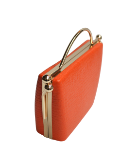 R04/5673 – Precioso y original bolso de fiesta o bolso clutch naranja. Se trata de un bolso diseñado tipo cestito , forrado en polipiel naranja con textura de escamas y, con un asa de metal dorado para llevarlo como bolso de mano. Presenta el cierre metálico con cuatro bolitas doradas. Incluye cadena dorada en el interior para llevarlo colgado.