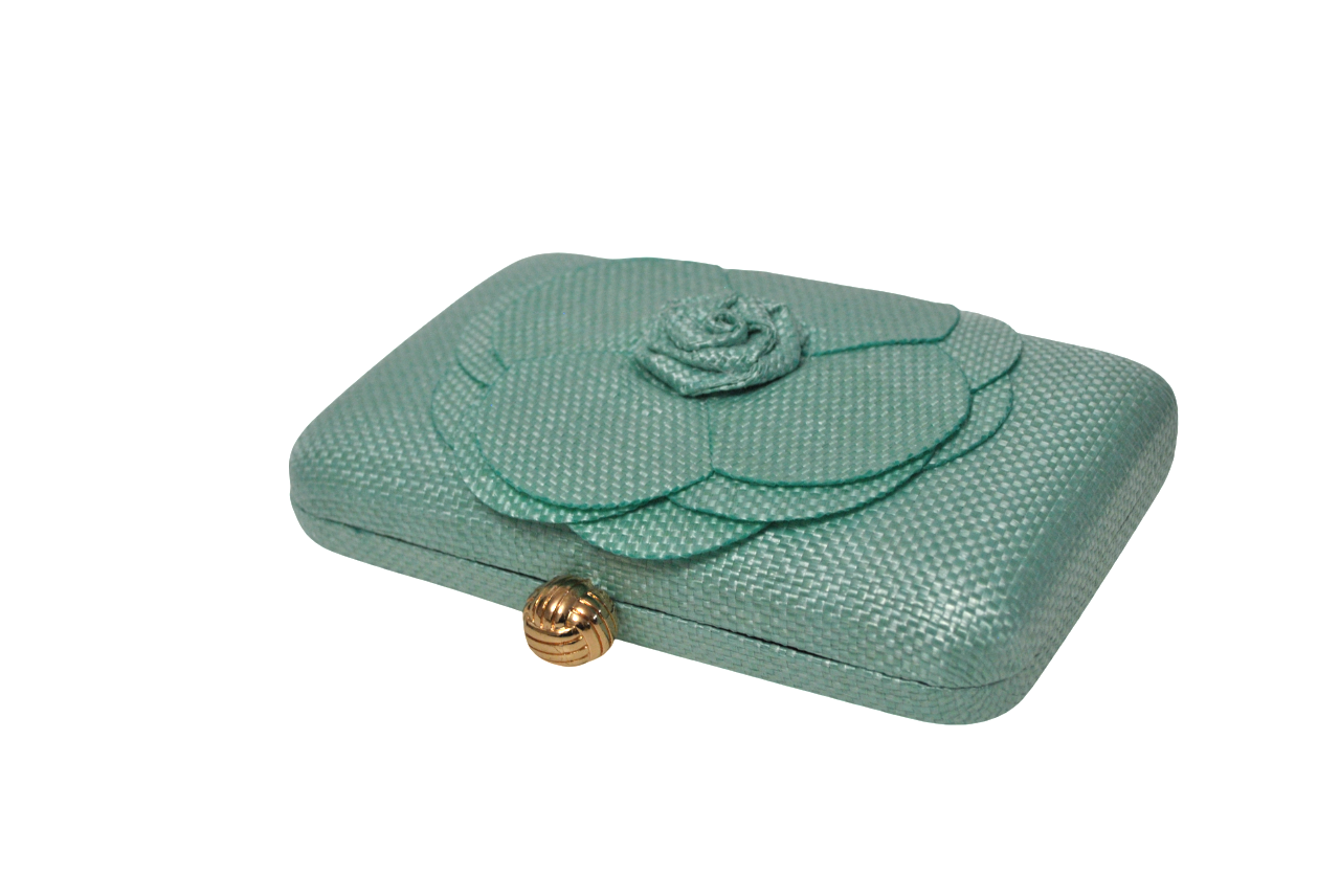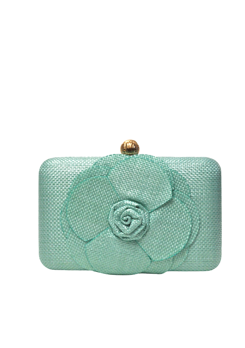 DV016040 – Precioso bolso de fiesta o clutch color verde agua. Se trata de un clutch fabricado en rafia, diseñado ligeramente con forma ovalada y decorado con una flor de rafia en el frente. Presenta el cierre y metal en dorado. En el interior se incluye una cadena larga dorada para llevarlo colgado en el hombro.