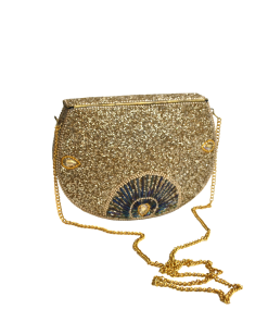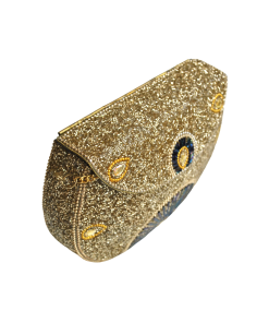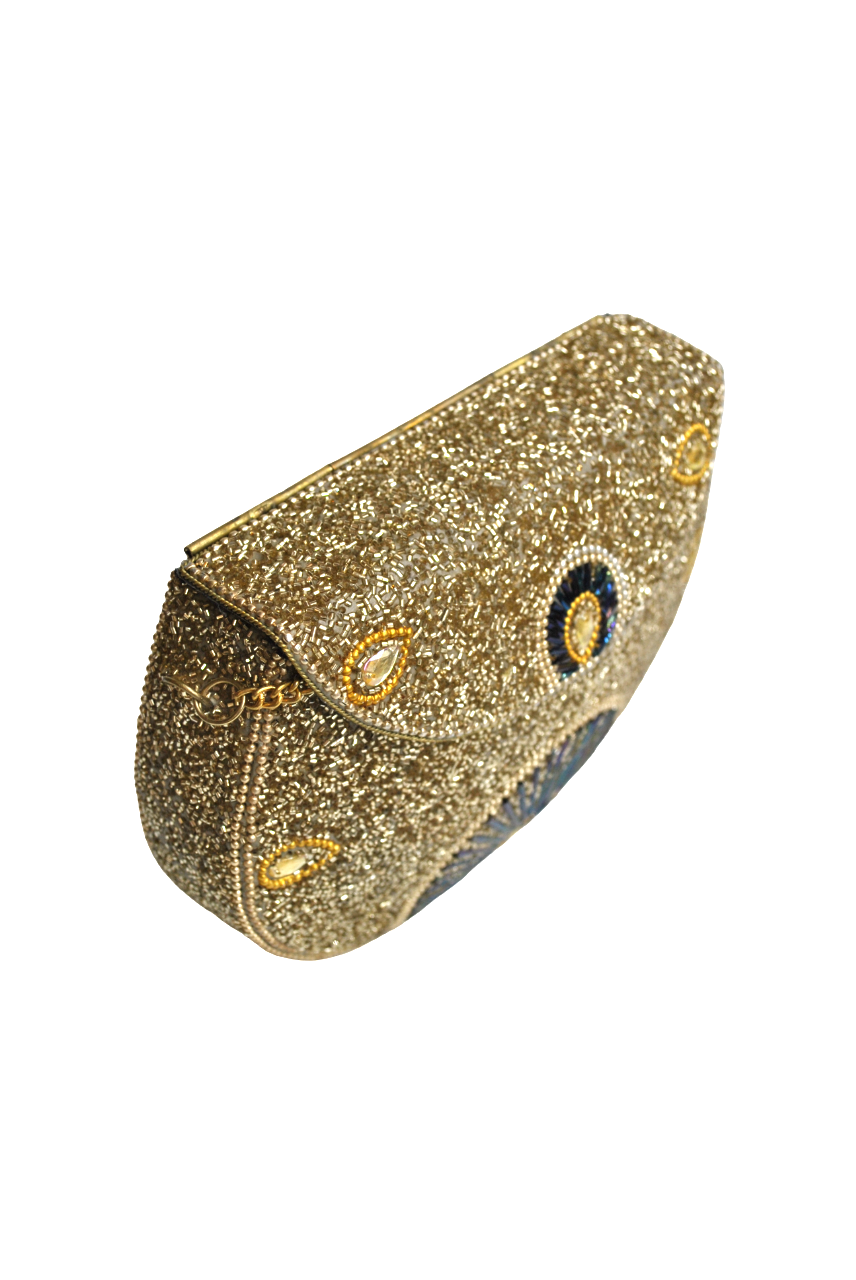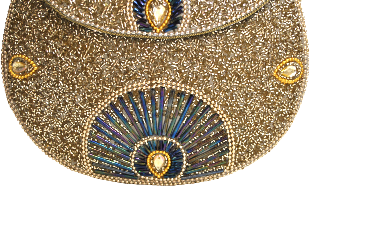 RF: 04/5699 – Maravilloso bolso de fiesta clutch rígido. Se trata de un bolso fabricado en latón dorado y revestido con cuentas doradas envejecidas. Además, presenta cuentas en tonos azules con ligeros brillos tornasolados. Sin duda, es el bolso perfecto para cualquier ocasión con el que no pasarás desapercibida. Incluye cadena dorada para llevarlo más cómodamente colgado,