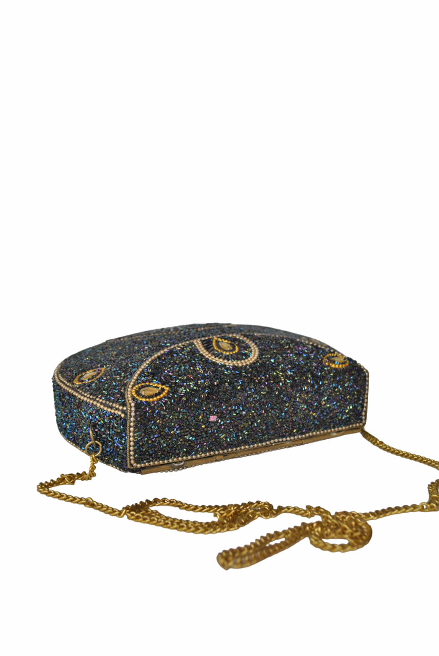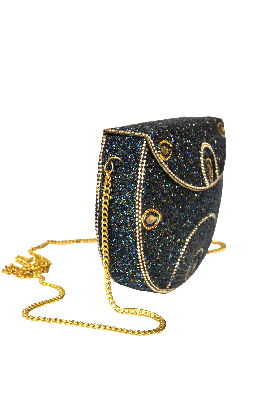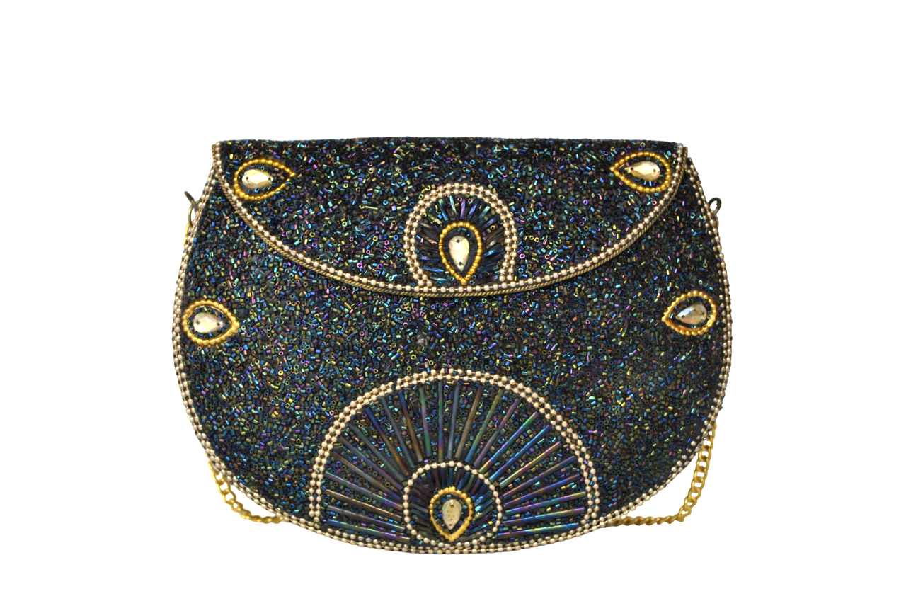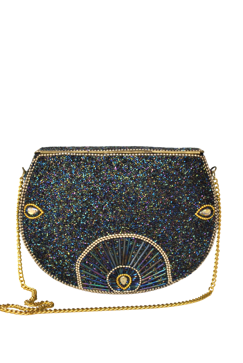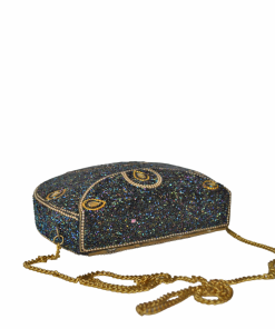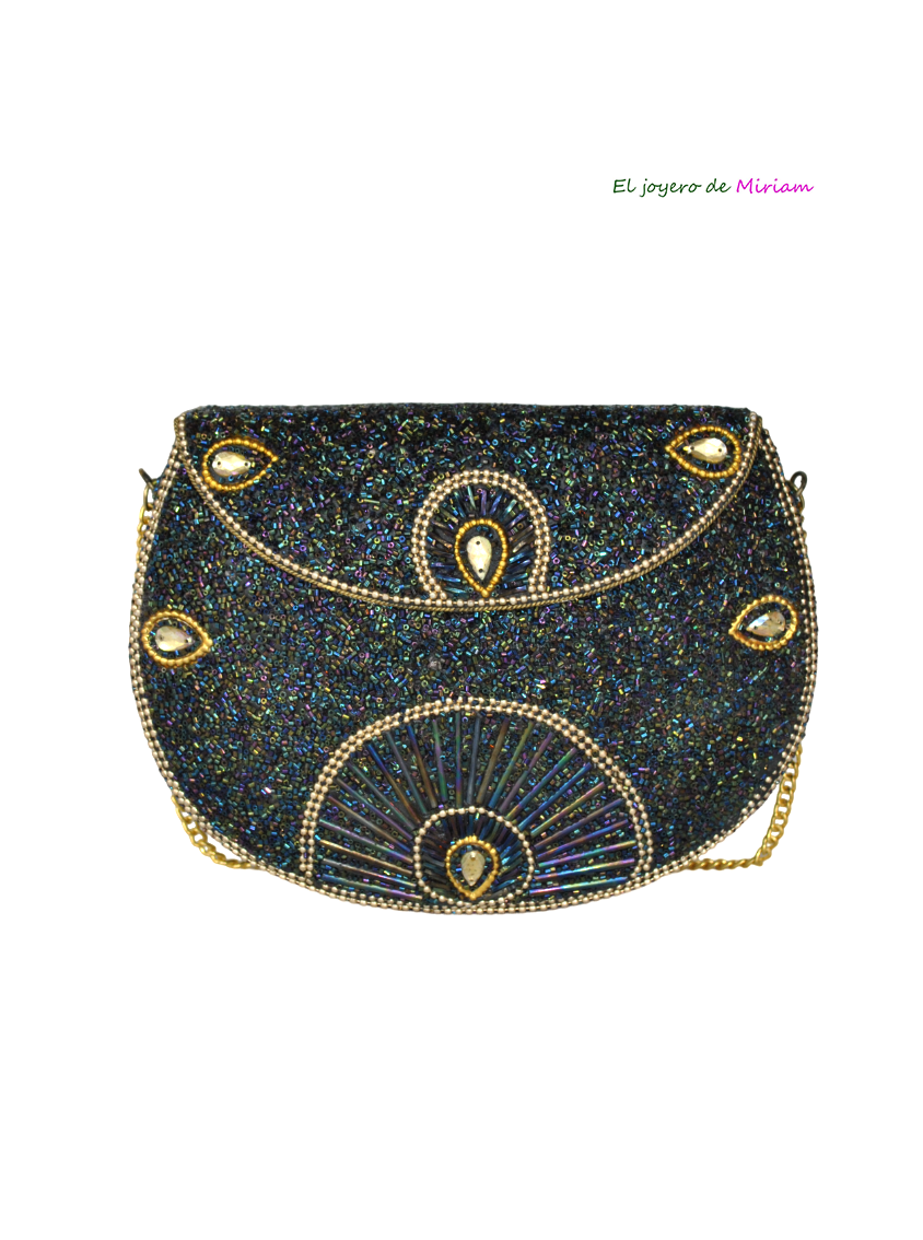 R09245071BI5827 – Maravilloso bolso de fiesta clutch rígido. Se trata de un bolso fabricado en latón, con fondo negro y, decorado con cuentas azules, moradas, verdosas y alguna que otra dorada. Sin duda, es el bolso perfecto para cualquier ocasión con el que no pasarás desapercibida. Incluye cadena dorada para llevarlo más cómodamente colgado,