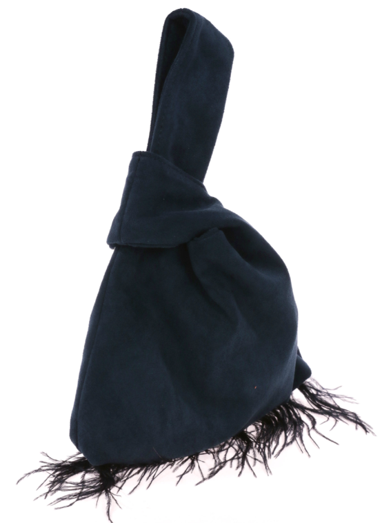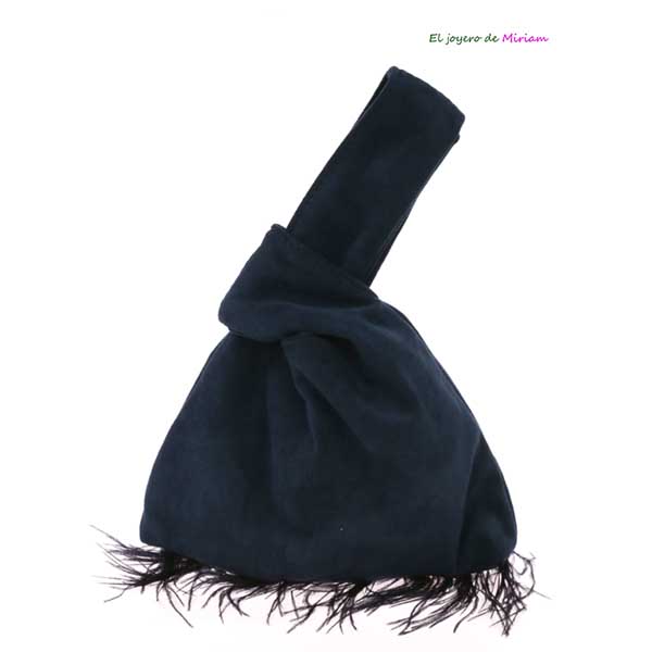 REF: 5688 Precioso y original bolso de fiesta clutch azul marino. Se trata de un bolso diseñado en forma de saquito y confeccionado en tela de antelina. Destaca un pequeño faldón con vaporosas plumas del mismo tono. No incluye cadena, es un estiloso bolso perfecto para llevarlo de mano.