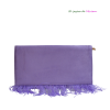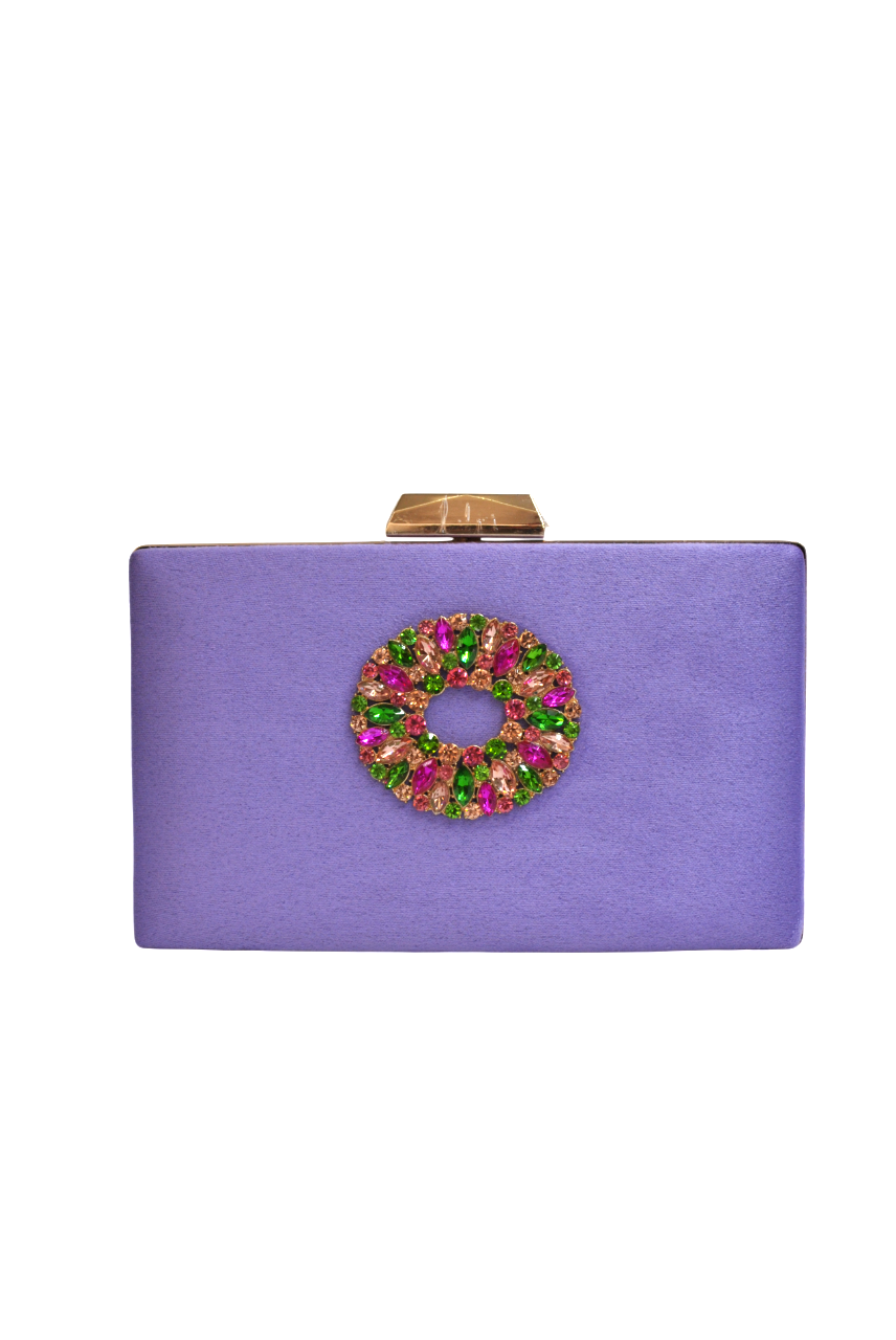 R04/5665 – Precioso bolso de fiesta clutch violeta. Se trata de un bolso rectangular forrado en antelina de color violeta. La parte delantera está decorada con un broche circular con cristales combinados en tonos rosas, verdes y fucsias. El broche es en dorado y, además, incluye cadena larga dorada.