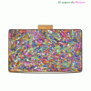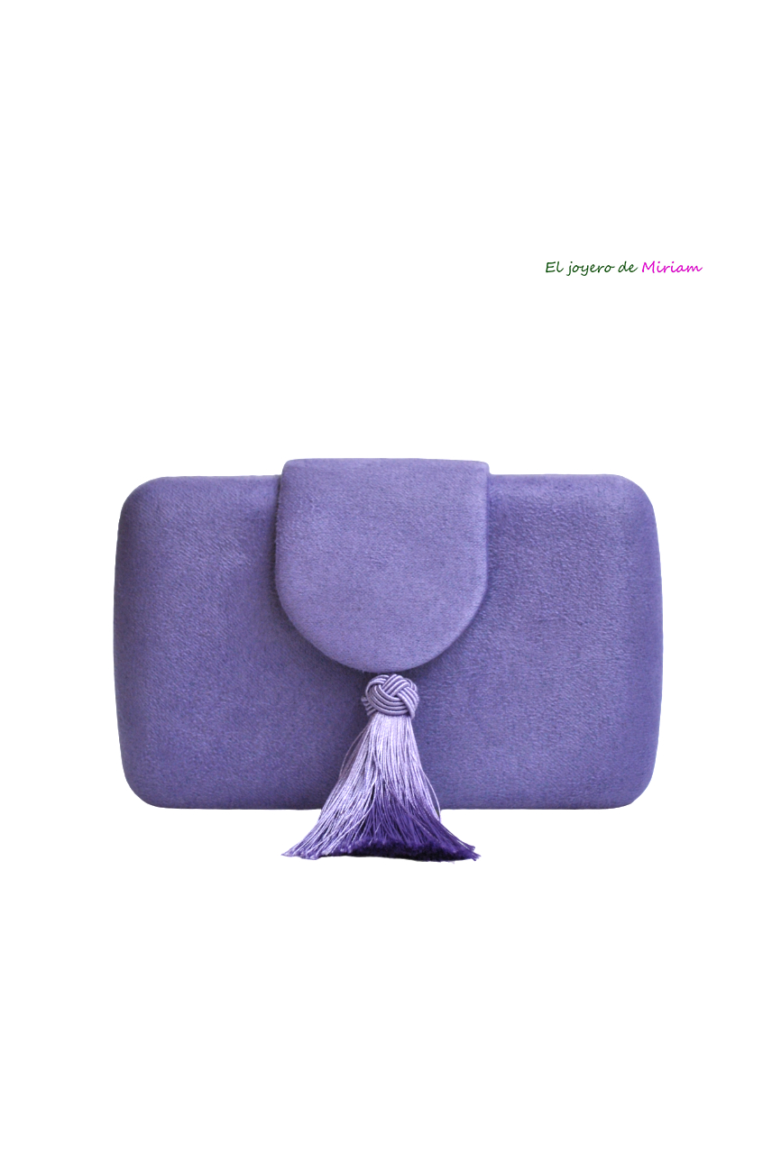 R04/5680 – Precioso y elegante bolso clutch de fiesta color violeta. Se trata de un bolso de fiesta forrado en tela de antelina de color violeta. En la parte central destaca un original pompón de flecos de seda. Incluye cadena dorada para llevarlo más cómodamente colgado.