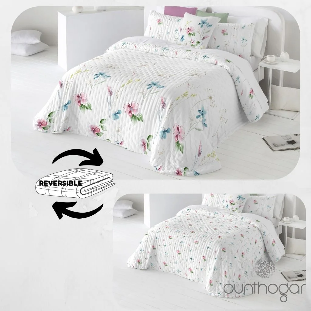 Colcha de verano y entretiempo en tejido alta calidad en patrón estampado de flores en las dos caras de la colcha, lo que la convierte en una prenda reversible que implica que se puede colocar por ambos lados. Es una colcha bouti de acolchado fino 100gr rematada con vivo a tono, con un tacto muy suave. Está disponible para su compra en varios tamaños de cama en color único.