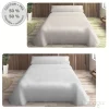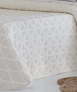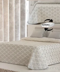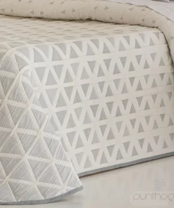 Esta colcha cubrecama destaca por su diseño geométrico de triángulos entrelazados que se van reduciendo en tamaño progresivamente hacia la parte del cabecero, creando un efecto visual dinámico y elegante. Este detalle, junto con su textura piqué y colores neutros (beis o gris), aporta un estilo moderno y sofisticado al dormitorio.