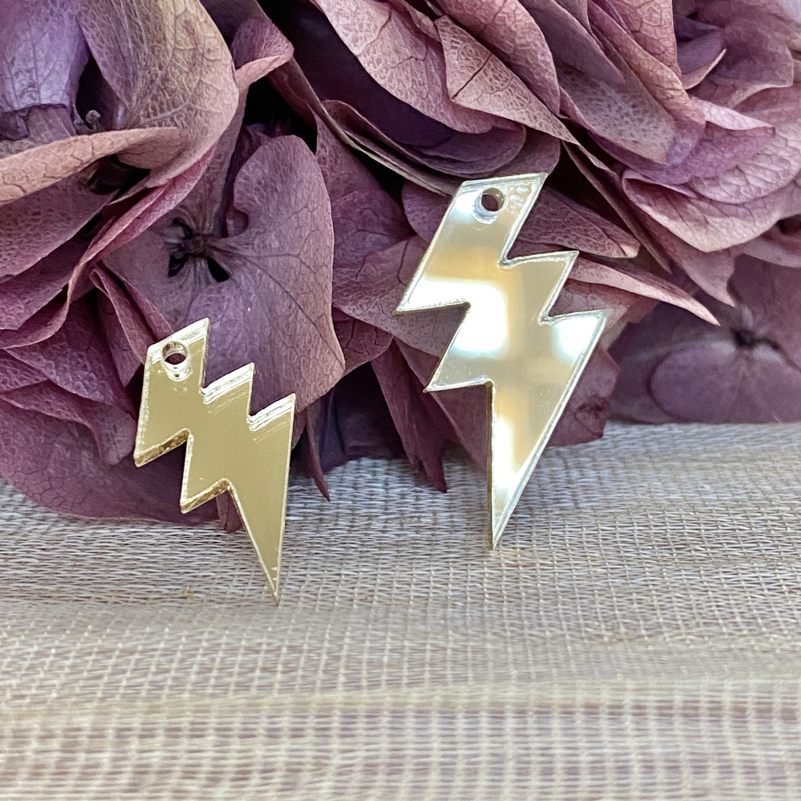 Colgante de rayo fabricado en metacrilato dorado espejo disponible en dos tamaños:
