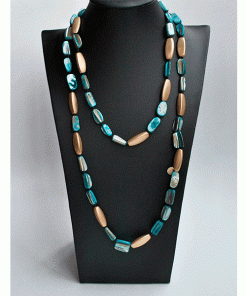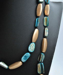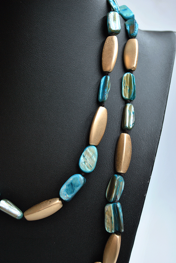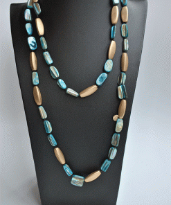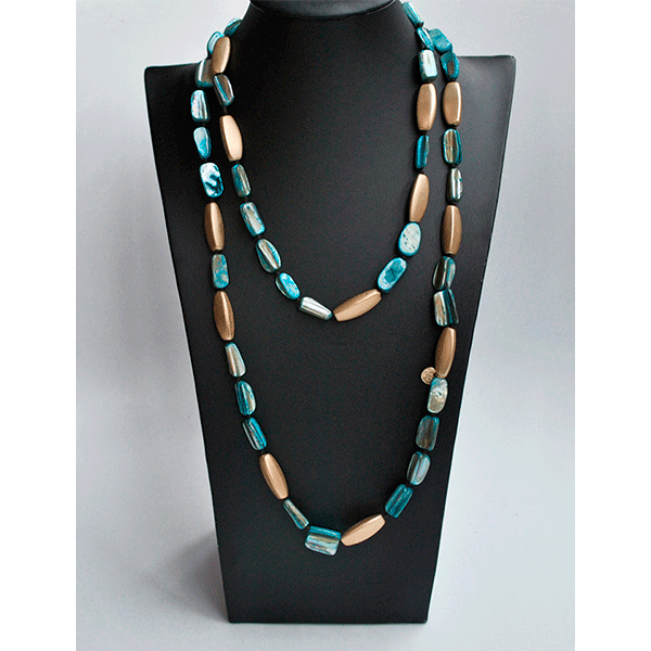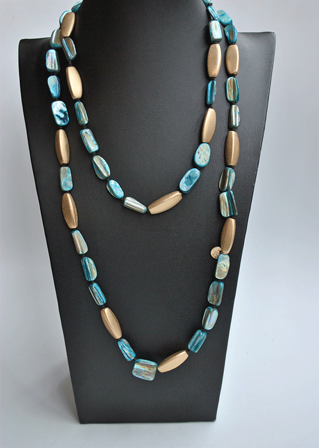R03/5359- Bonito collar largo de mujer. Se trata de un collar fabricado con aplicaciones de resina esmaltada en turquesa efecto nacarado combinados con aplicaciones doradas mate. Ideal para lucirlo con una sola vuelta o con dos.