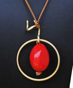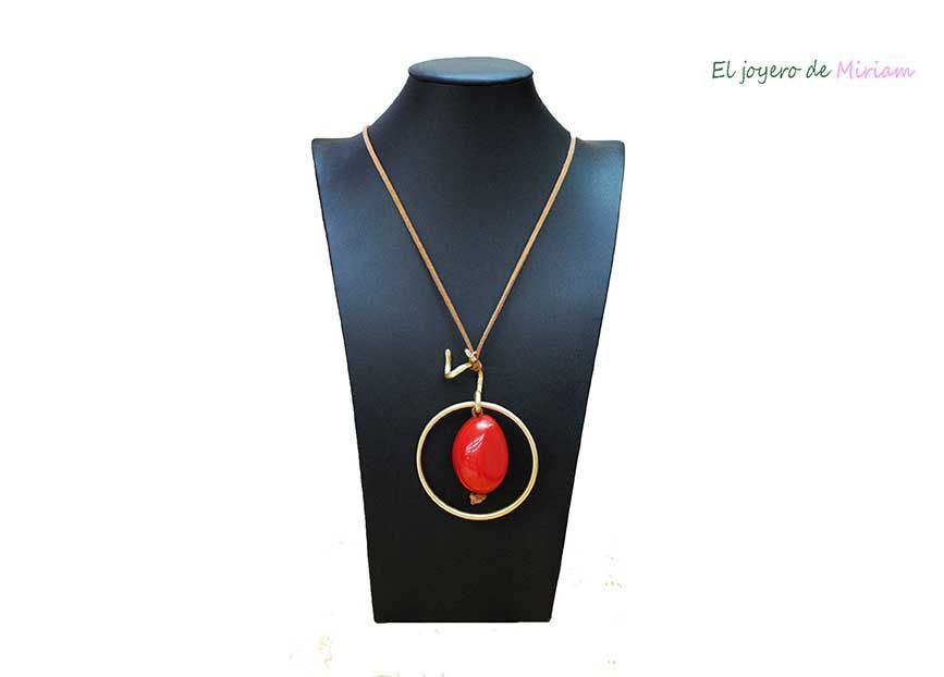 R19/2802 -Original y estiloso collar de mujer. Se trata de un collar con cordón auto ajustable para la altura que se desee llevar. Presenta bonito círculo realizado en metal ligero dorado y una pequeña filigrana también dorada. Además, destaca una gran piedra de resina en color rojo en el interior del mismo.