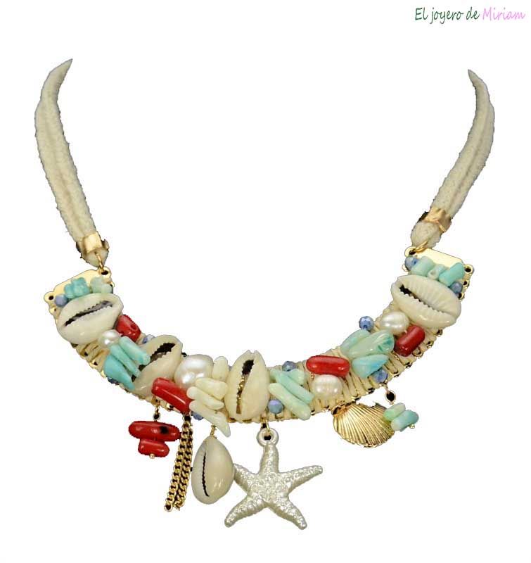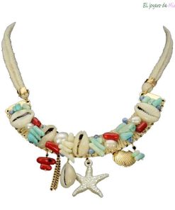 Collar corto fabricado con un cordón beige. Está decorado con pequeñas piedras rojas y azules, perlas y conchas. Llama la atención la estrella marina, la concha, las piedras y la almeja que cuelga.