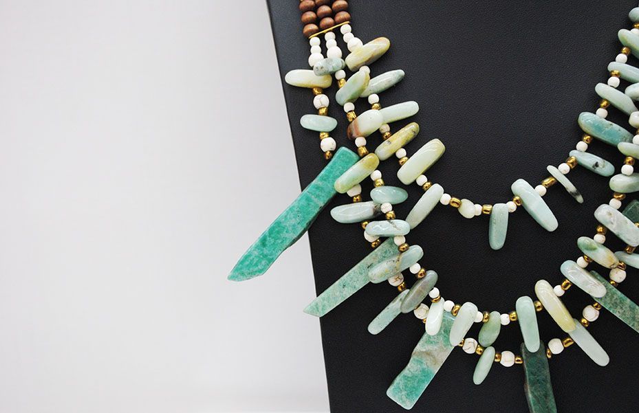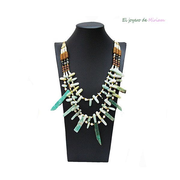 Precioso collar largo de mujer fabricado con bonitas piedras de color azul turquesa combinadas con cuentas blancas y doradas. Además, presenta pequeños abalorios de madera y la cadena autoajustable de cuero en color blanco.
