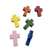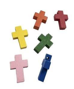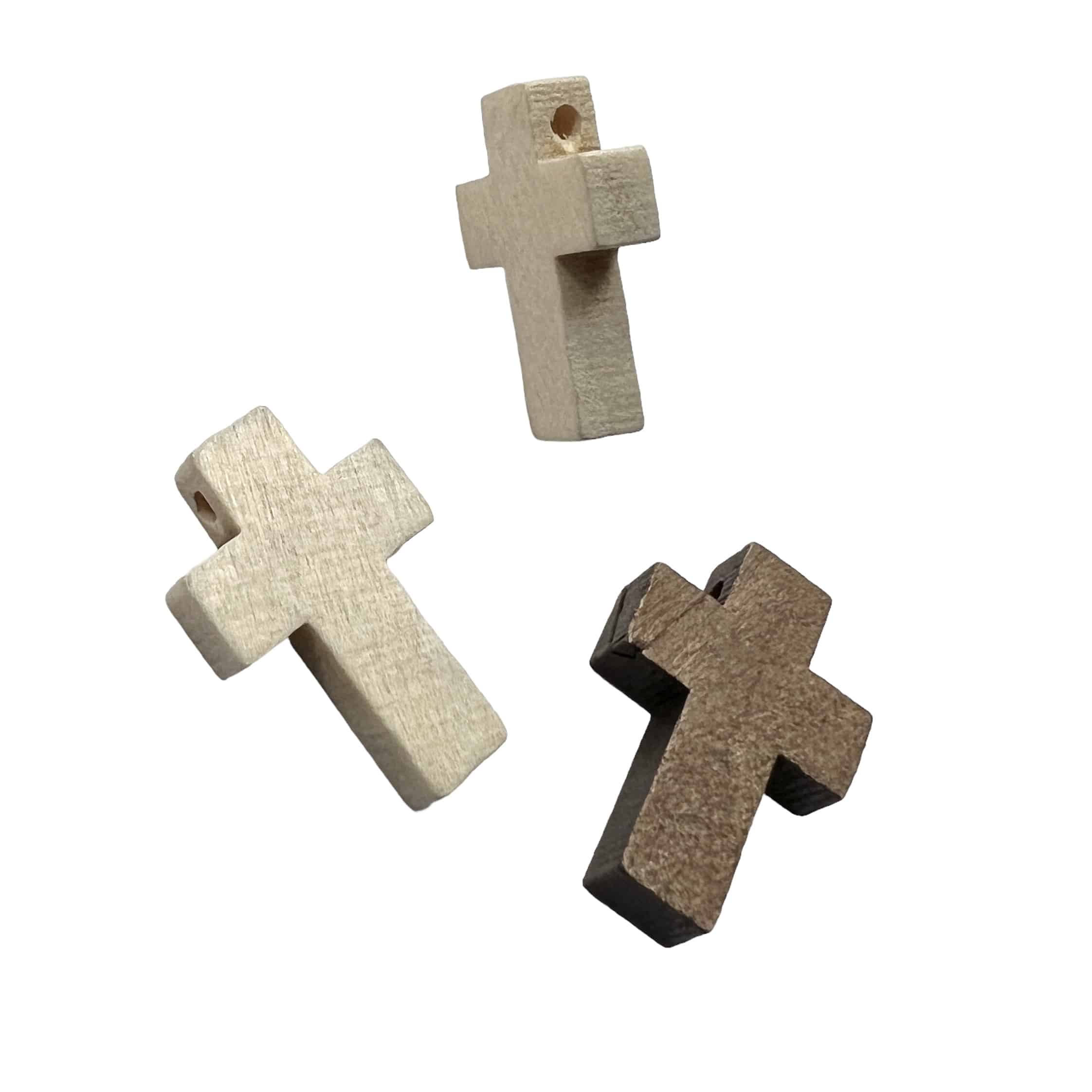 Colgante de una cruz de madera con un tamaño de 22×14 mm con un pase en la parte superior de 1-1,5 mm, disponible en dos colores.