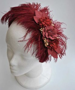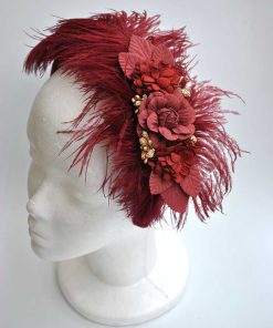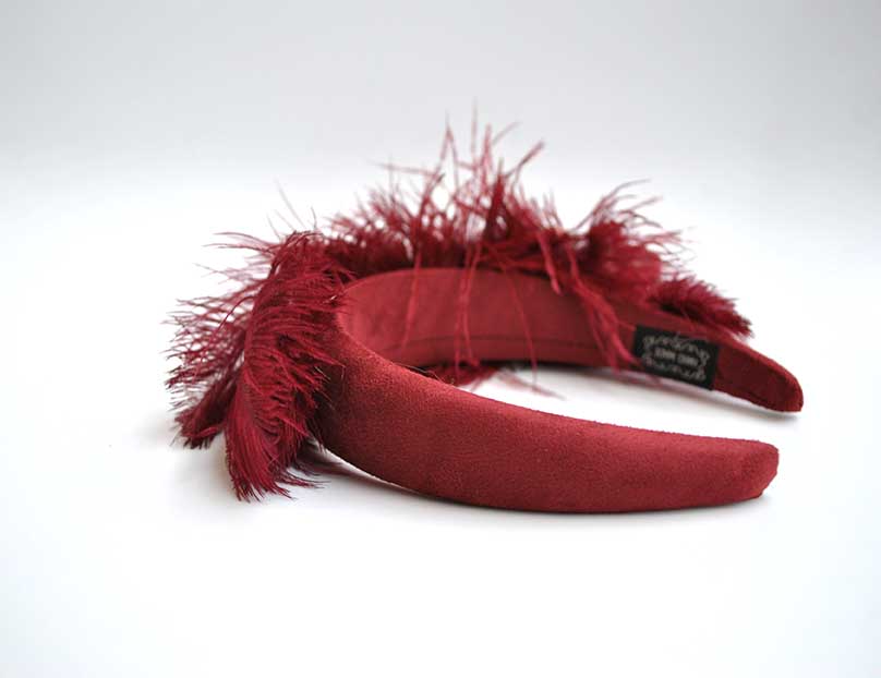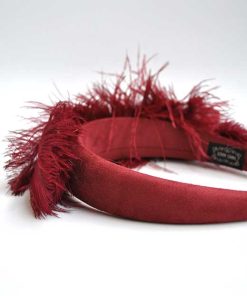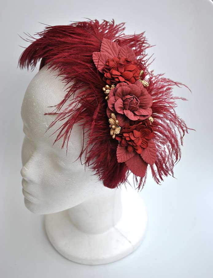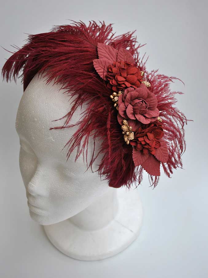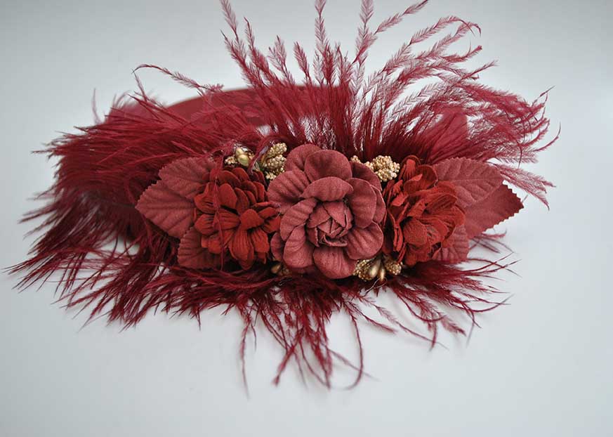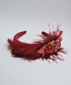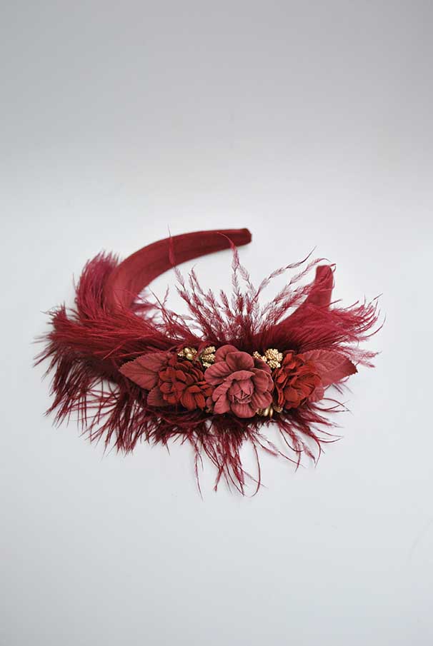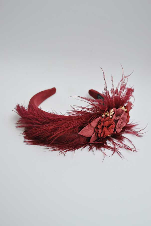 RHD03 – Bonita diadema tocado en color burdeos. Se trata de una diadema forrada de antelina en color burdeos y decorada con elegantes flores y vaporosas plumas del mismo tono.