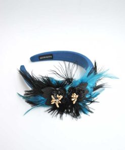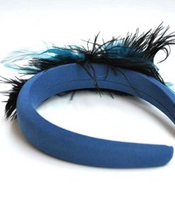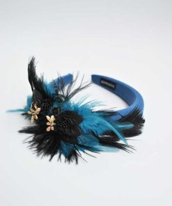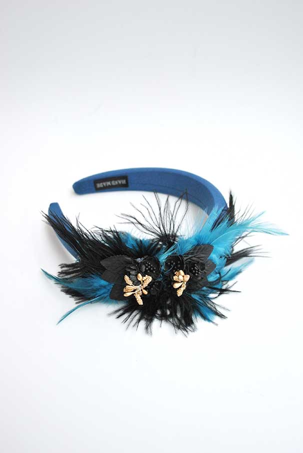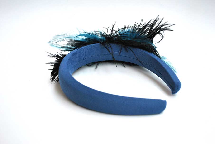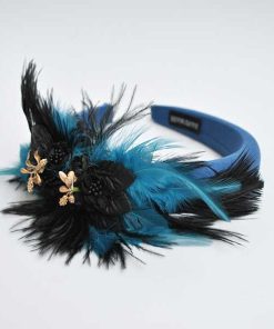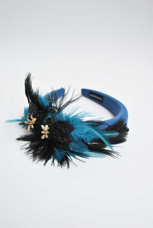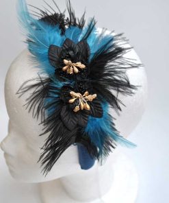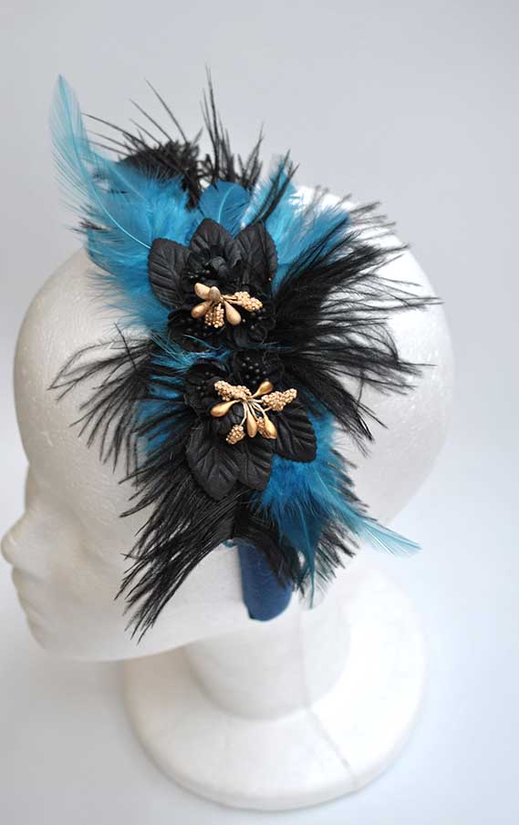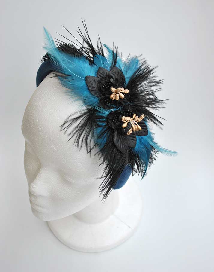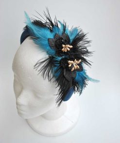 R03/19930 – Preciosa diadema de fiesta confeccionada artesanalmente. Se trata de una diadema azul petróleo decorado con plumas petróleo combinadas con plumas negras y dos elegantes flores.